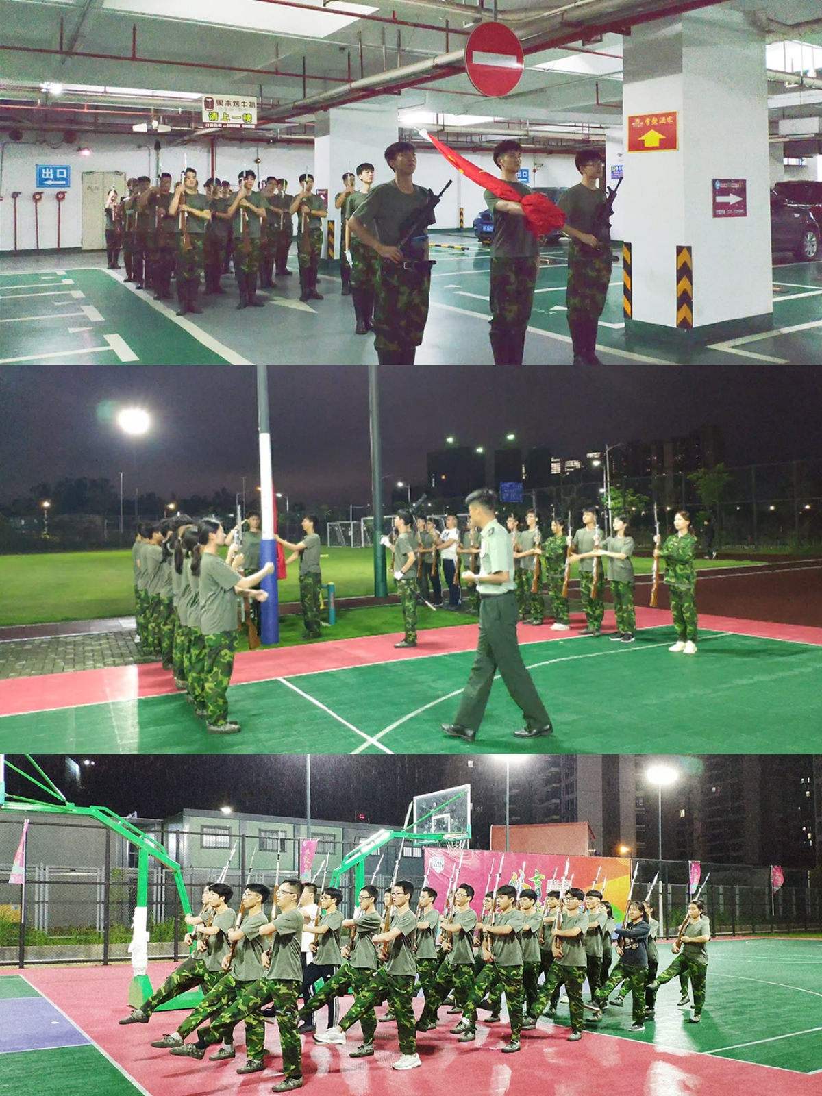 到了正式比赛,大家在雨里站了近两个小时,雨水打湿了外套渗进了衬衫里,帽檐在滴水,正印证了当初训练时的那句话——“小雨当流汗,大雨接着干”。尽管天气不好,但是我们的热情不变,我们的精神依旧饱满,我们的斗志依旧昂扬。