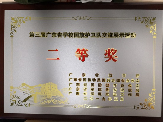 5月8日一早,伴随着断断续续的雨声,我校国旗护卫队便整装待发,集体前往广州科技贸易职业学院。我校国旗护卫队于2019年1月初新生军训期间首次整队完毕,正式成立仅5个月,期间所有队员都坚持每周高强度的训练,在短时间内迅速成长,充分表现出深技大学子最昂扬的斗志与精神面貌。这是队员们首次参加此类交流展示活动,虽天公不作美,同学们在大雨中参与了活动,却依然信心十足地迈开步伐,以初生新星的自信姿态完成比赛,展示了kaiyun开云官方网站学子的青春风采,最终荣获本次交流展示活动的二等奖。