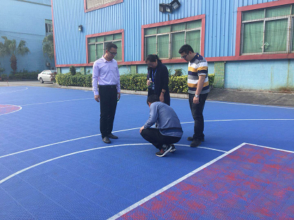 随后,张岩鸿副主任及体育部老师来到厂家已经铺设好悬浮地板的篮球场地,对悬浮地板的弹性、安全性、防滑性以及防水情况进行亲身体验。