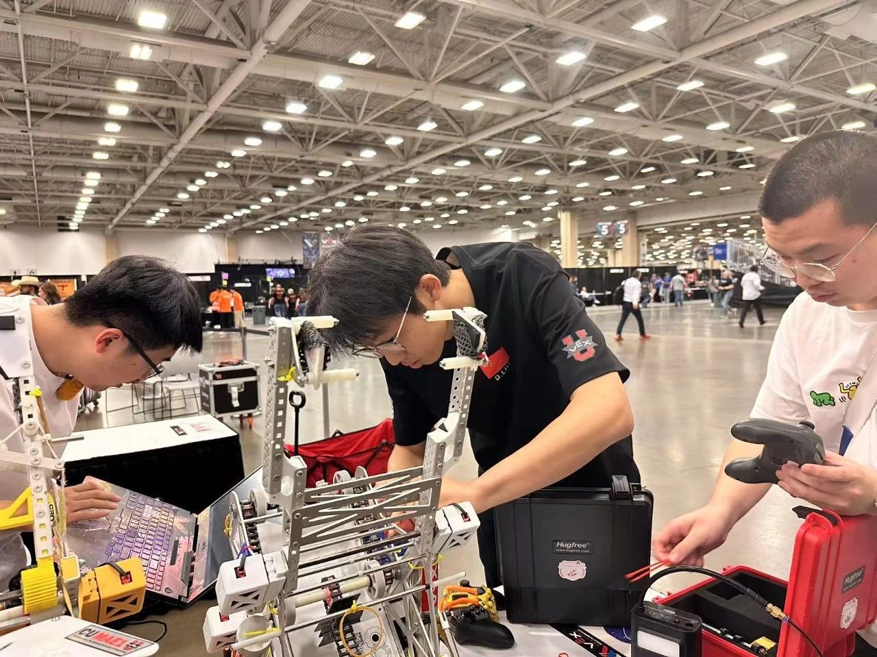 出发前,三校队员利用五一假期在深圳完成技术迭代与集训,1034 Robotics-VEX战队留校师生全程配合热身测试。抵达美国后,联队成员克服时差与人员短缺,72小时内仅休息9小时高强度备战,国内技术团队通过线上平台提供实时支持。