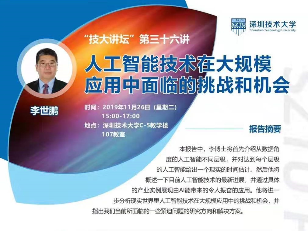 主讲人:李世鹏时间:2019年11月26日(星期二)15:00-17:00地点:kaiyun开云官方网站C-5教学楼107教室主题:人工智能技术在大规模应用中面临的挑战和机会主讲人简介:李世鹏博士,IEEE会士、国际欧亚科学院院士,拥有中国科学技术大学学士、硕士学位及美国里海(Lehigh)大学博士学位。现任深圳市人工智能与机器人研究院(AIRS)副院长。曾任中国某领先人工智能企业的集团副总裁及研究院联席院长,某领先中国物联网企业的首席技术官...