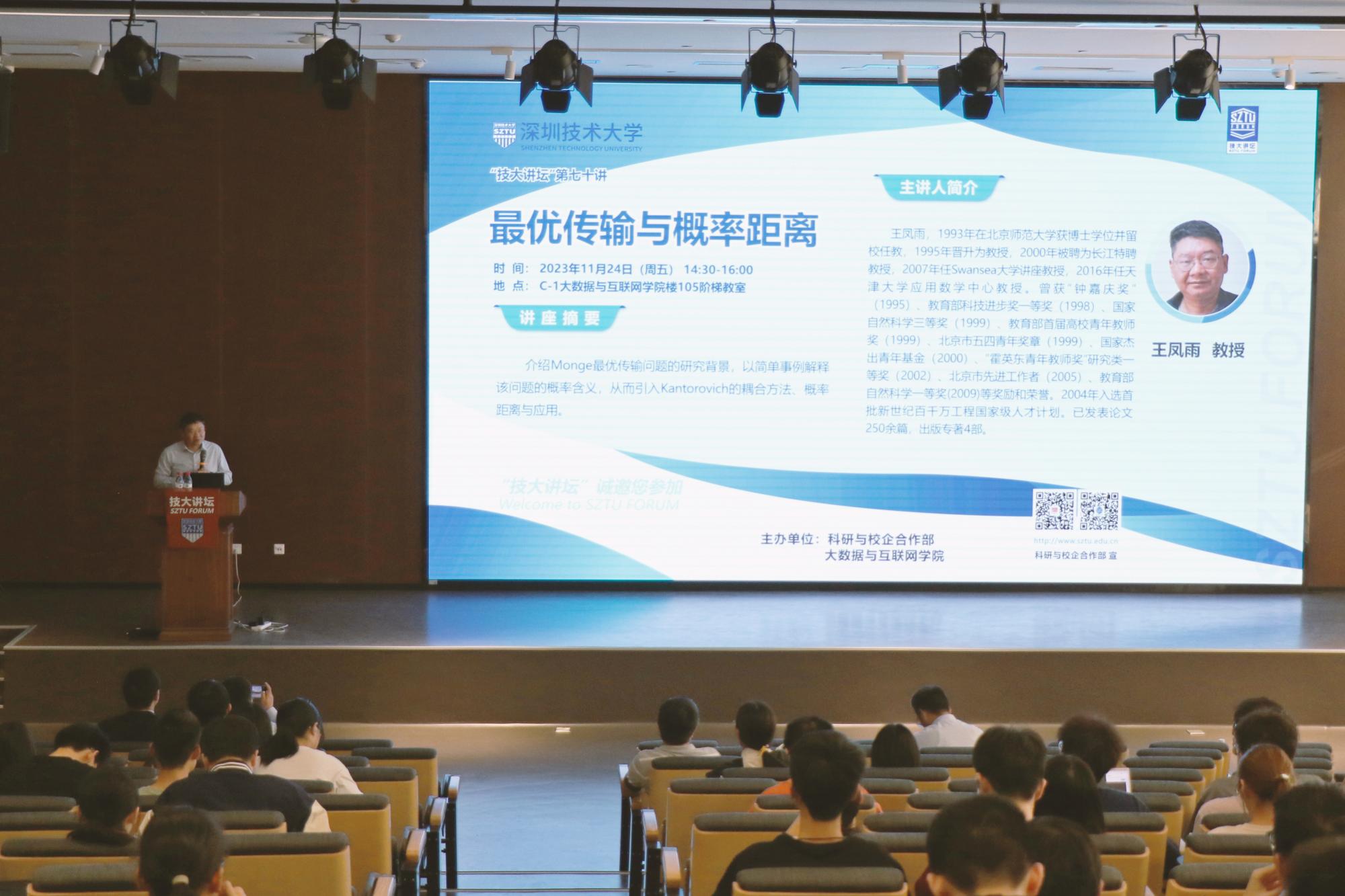 2023年11月24日,“技大讲坛”第七十讲在kaiyun开云官方网站圆满举行。本次讲座由天津大学讲席教授王凤雨主讲,主题为“最优传输与概率距离”。大数据与互联网学院党总支书记叶建华教授主持讲座。 王凤雨教授介绍了Monge最优传输问题的研究背景,通过通俗易懂的事例解释最优传输问题的概率含义,从而引入Kantorovich的耦合方法和概率距离,探讨了最优传输和概率距离在数学、物理、经济金融、图像处理、机器学习等领域的应用。交流问答...
