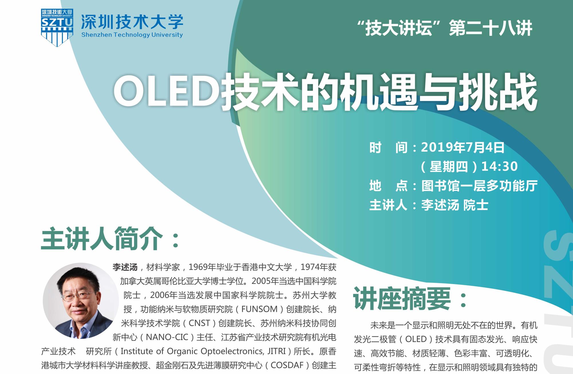 时间:2019年7月4日(星期四)14:30地点:图书馆一层多功能厅主题:OLED技术的机遇与挑战主讲人:李述汤院士报告摘要:未来是一个显示和照明无处不在的世界。有机发光二极管(OLED)技术具有固态发光、响应快速、高效节能、材质轻薄、色彩丰富、可透明化、可柔性弯折等特性,在显示和照明领域具有独特的优势,在移动通讯、计算机及平板电视等信息显示领域已进入商业化阶段,同时在柔性显示、可穿戴显示、室内照明及医疗照明等领...