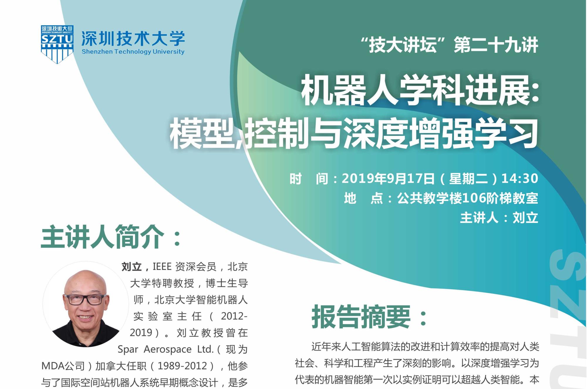 2019年9月17日,北京大学特聘教授、深圳市人工智能产业协会机器人应用首席科学家刘立教授应邀来访kaiyun开云官方网站,做客“技大讲坛”,为师生举行了一场题为《机器人学科进展:模型、控制与深度增强学习》的主题讲座。讲座由中德智能制造学院院长吕启涛教授主持,共有200名师生参与了此次讲座。近年来人工智能算法的改进和计算效率的提高对人类社会、科学和工程产生了深刻的影响。以深度增强学习为代表的机器智能第一次以实例证明...